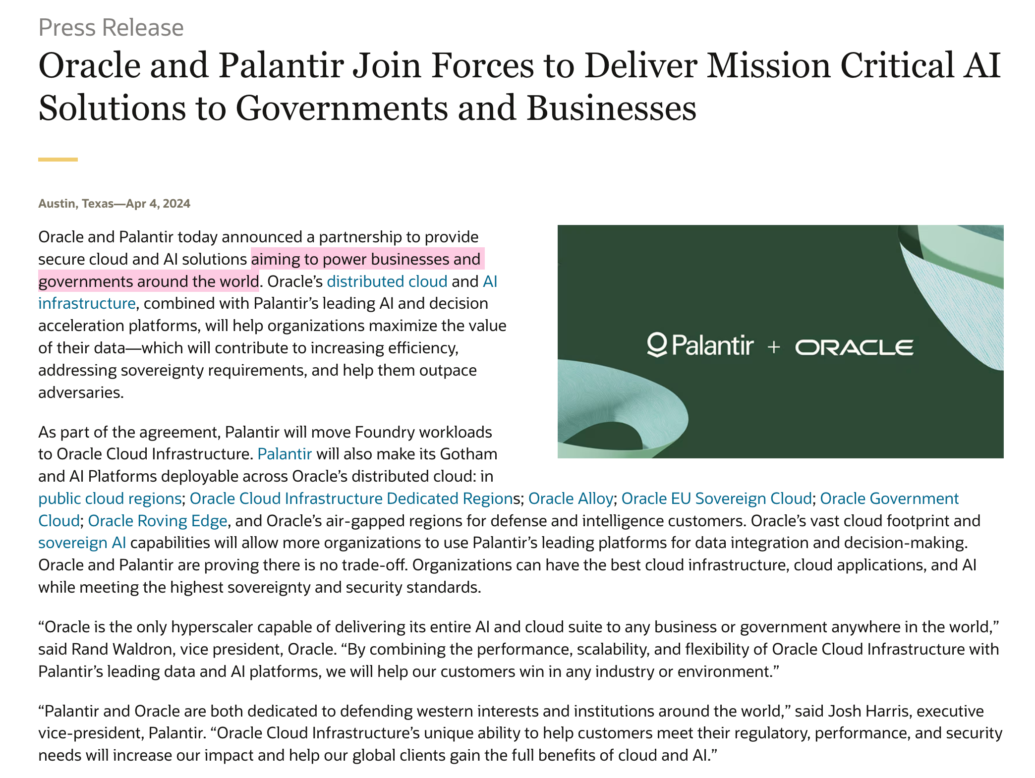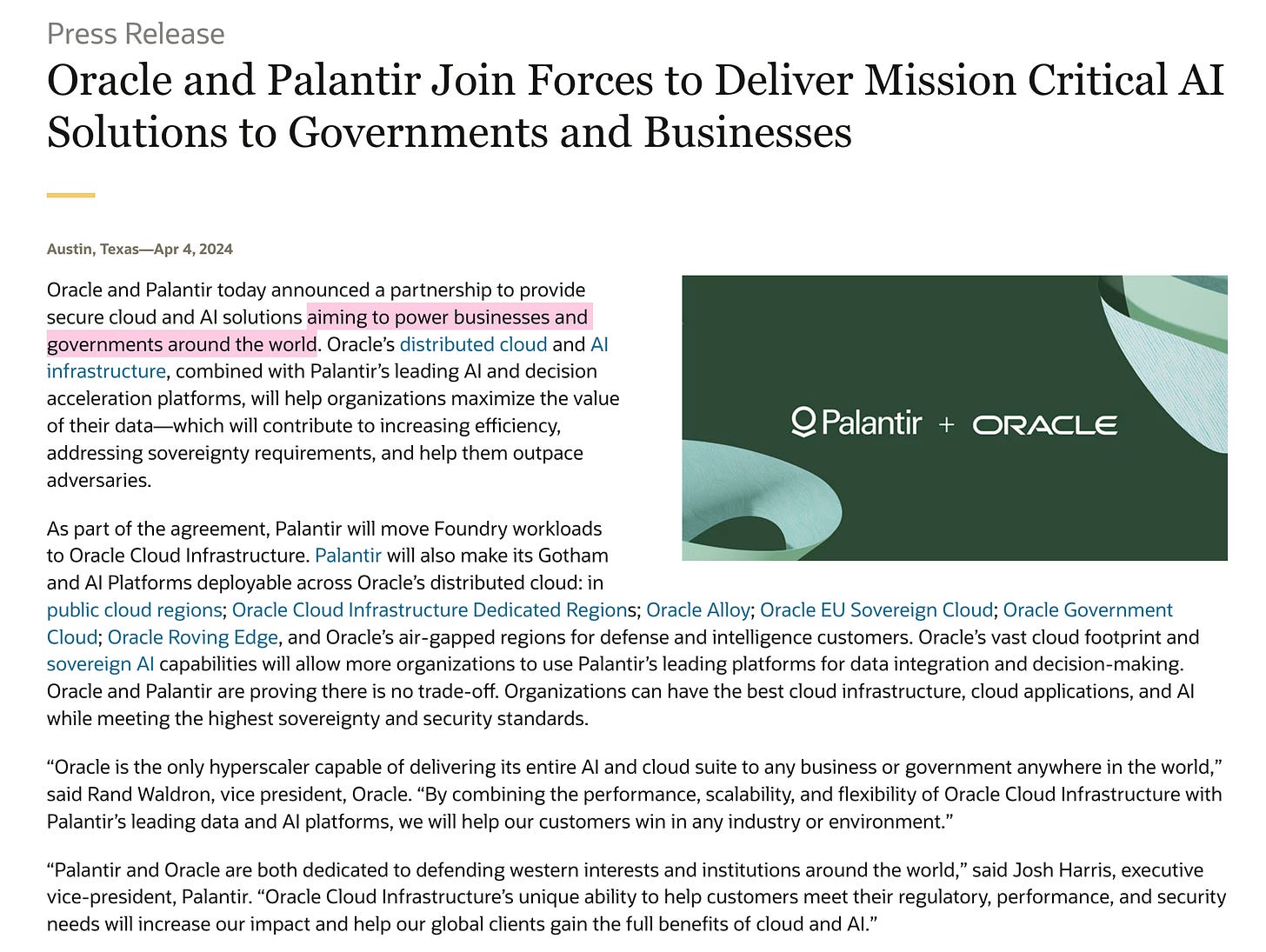 This is something that are trying to do not just here, but in governments all over the world. This creates a whole new age of global surveillance and it is anchored by a major partnership with Palantir. In fact, Oracle and Palantir made a huge announcement to this effect in…. April 2024. Which gives some indication to the fact of: they have been planning this for a long time.