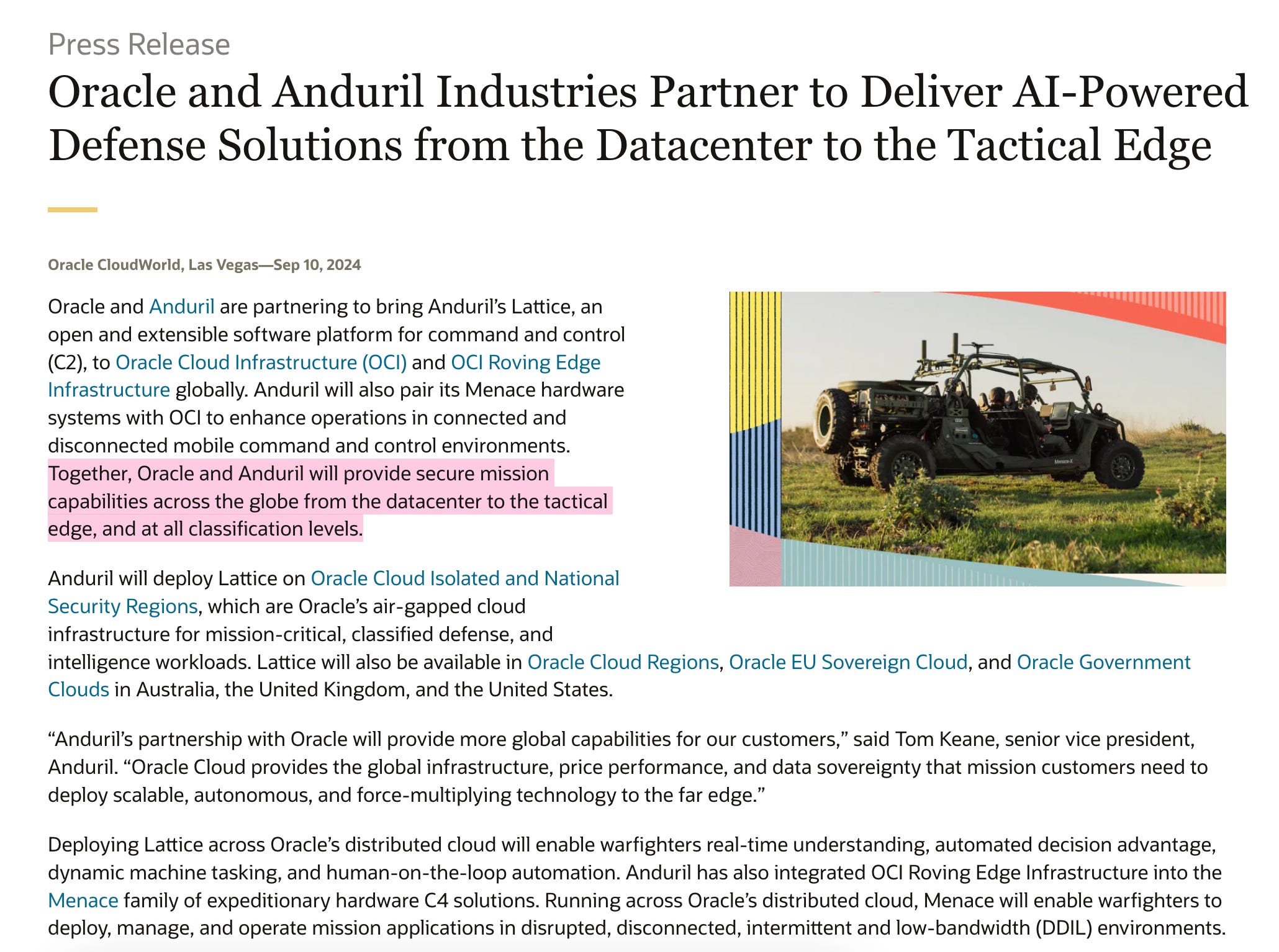 A few things to note here. This is a massive increase in the surveillance of the world’s peoples. All of their data ripped from them, put together in a monstrous, concentrated AI machine, that is then hooked up to the policing and military apparatus as well; in fact, Oracle of course has a huge deal with Anduril, the massive a16z and Founders Fund backed weapons company, also announced in 2024. They were ready. They knew they were going to get the presidency.