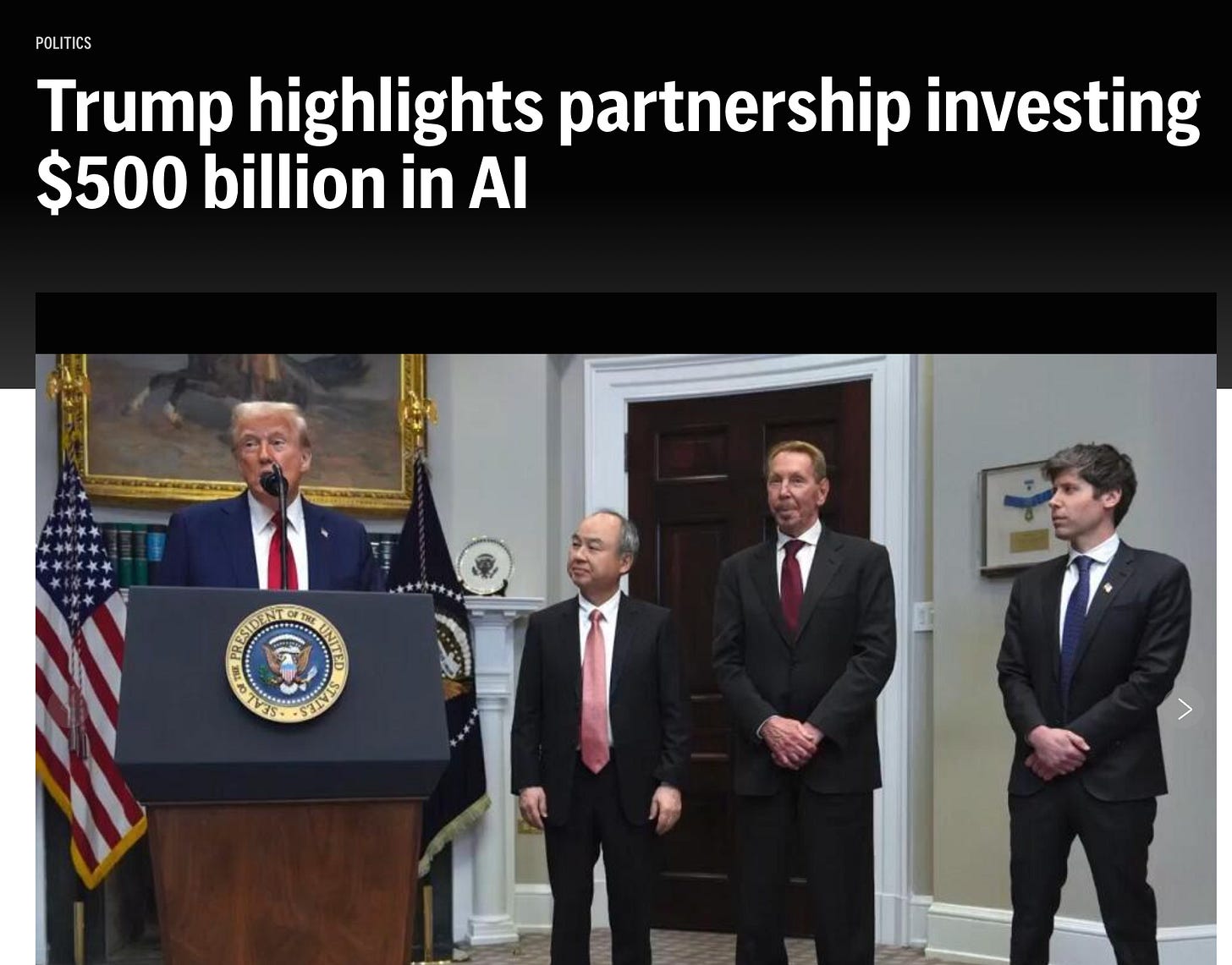 Here is Larry Ellison at the White House for the announcement of a major new AI initiative in January 2025, just days after inauguration. He’s in the middle, looking very stately and dapper as always. And tall!